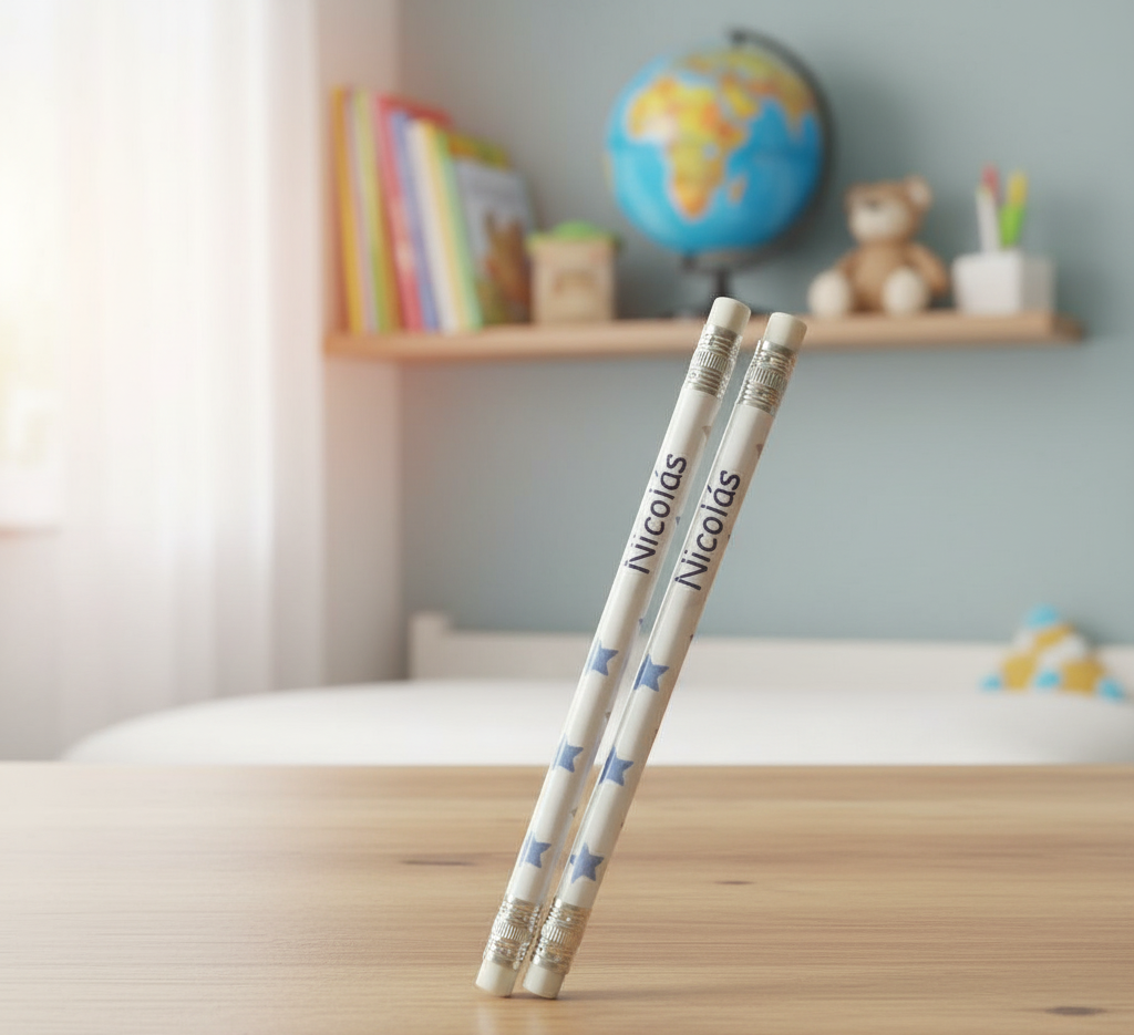 Lápices personalizados, diseñados a juego con otros productos de nuestra página. Podrás elegir estampado y nombre con el que personalizar tu lápiz. Ideales para regalos en cumpleaños, BBC u otros eventos. Pedido mínimo de 20 unidades aunque pueden llevar distintos nombres.
